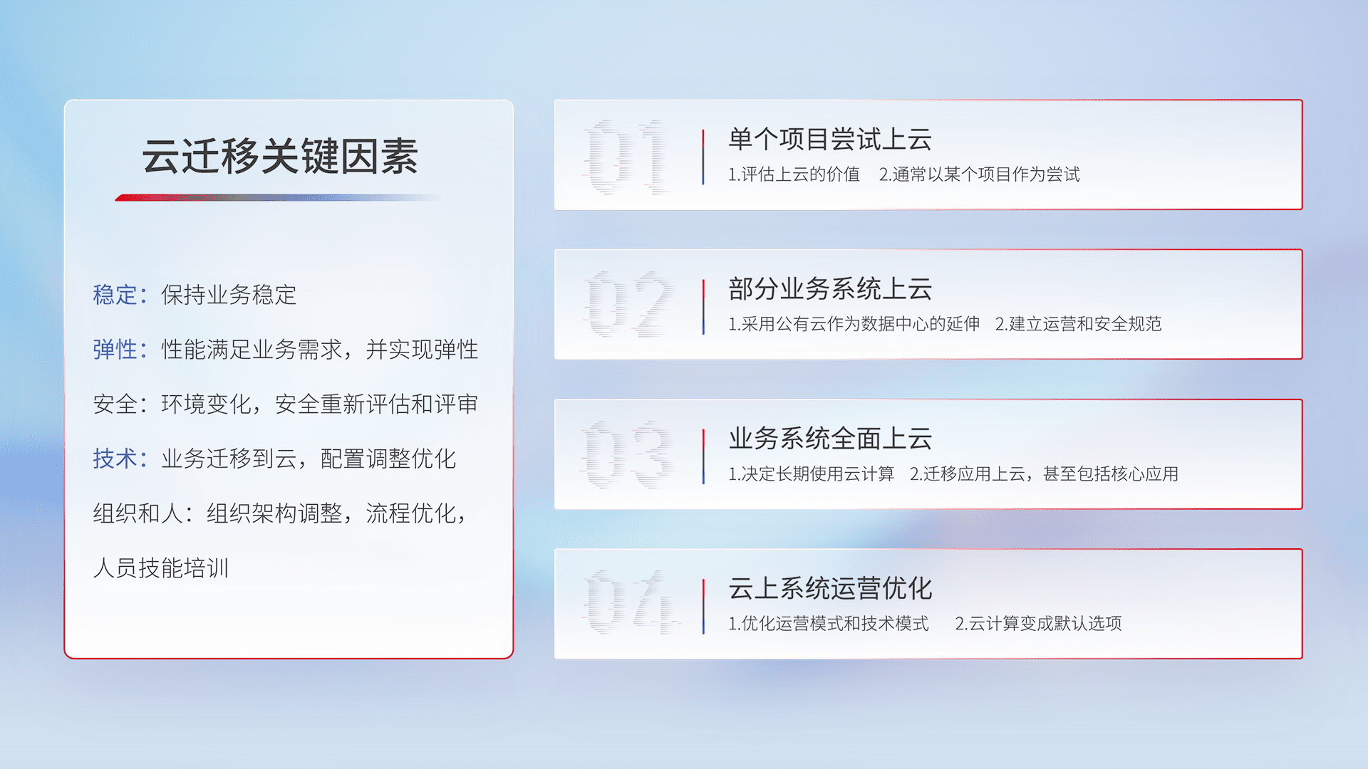 结合实际业务,,从规划设计、、、云平台选型、、云原生改造、、数据迁移、、集成交付,,,,迁移全过程为客户识别最佳上云路径,,做好风险识别管理,,,设计网络架构、、身份权限、、、安全审计合规、、操作审计、、、日志审计、、监控告警策略、、多站点容灾设计等,,,,对云上基础设施进行整体规划,,提升IT治理水平,,,,以满足弹性、、、、高可用、、高性能的需求。。