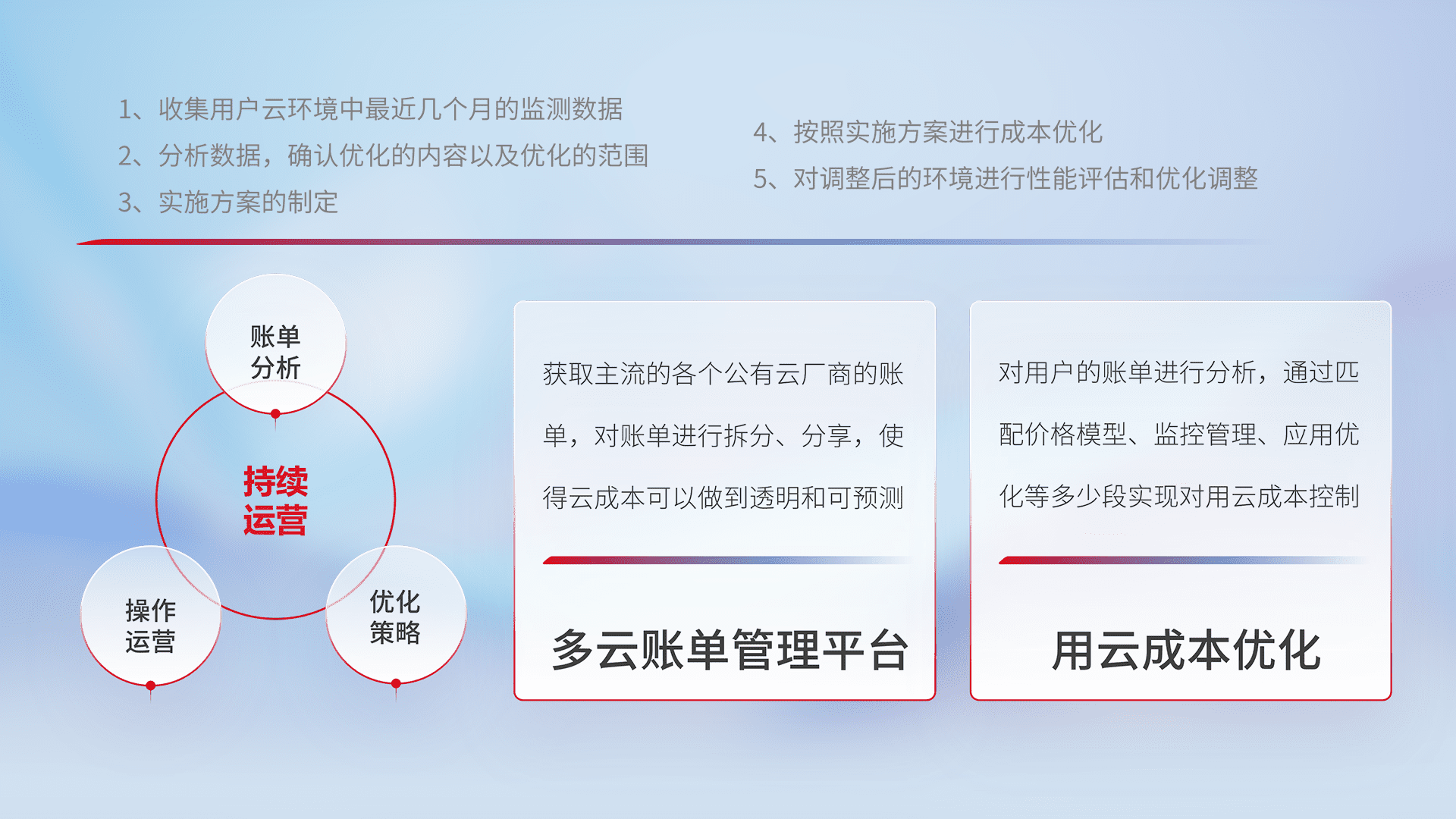 通过多云纳管,,,以统一的资源数据模型把客户的云资源进行抽象和封装,,,进而实现对多云资源的统一操作,,,,保障云资源管理的可靠性、、、、稳定性与可用性。。。量身定制化运维内容,,配置、、开发运维、、、、补丁管理、、、备份、、监控、、认证和访问管理、、、、审计和日常巡检等,,,,保障在用云过程中的可靠度,,稳定度以及高可用率。。。